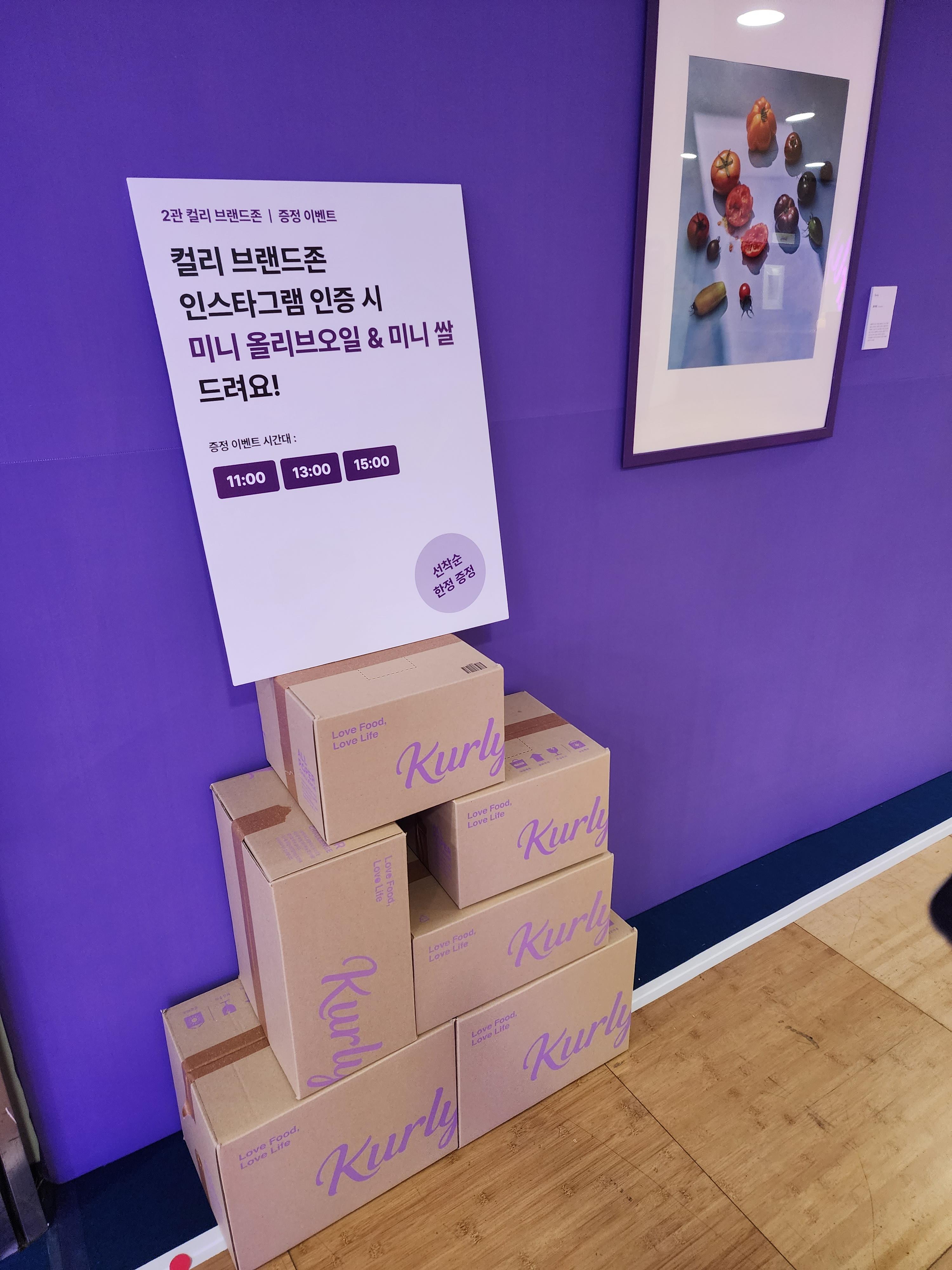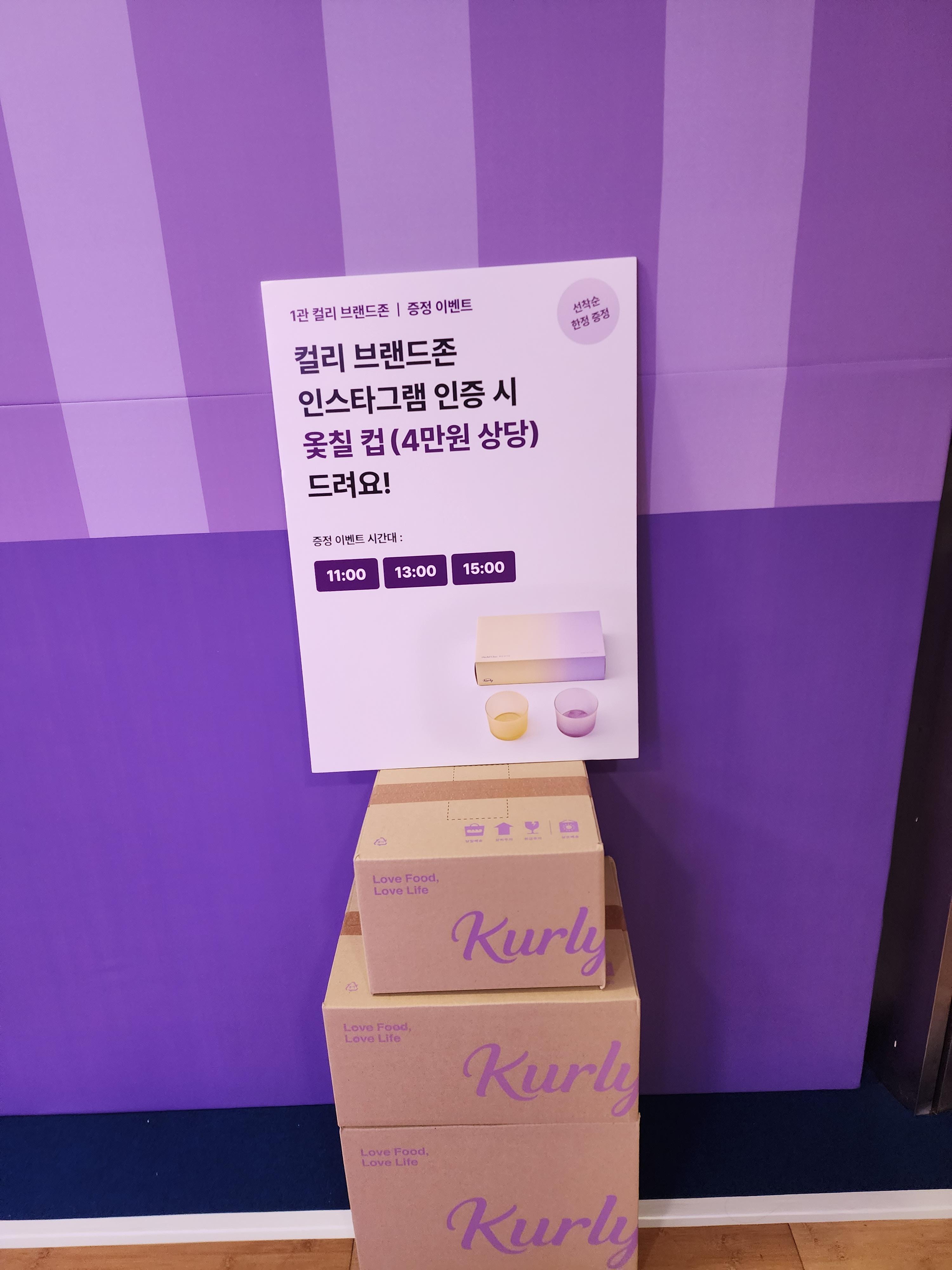 처음에는 어디에서 이벤트 하는지도 몰랐는데 오전 10시부터 오후 3시까지 있다 보니 컬리브랜드 부스에서 한다는 걸 알게 됐어요. 그리고 사람들이 먼저 줄을 서다 보니 30분 전부터 줄 서서 기다려야 받을 수 있더라고요.