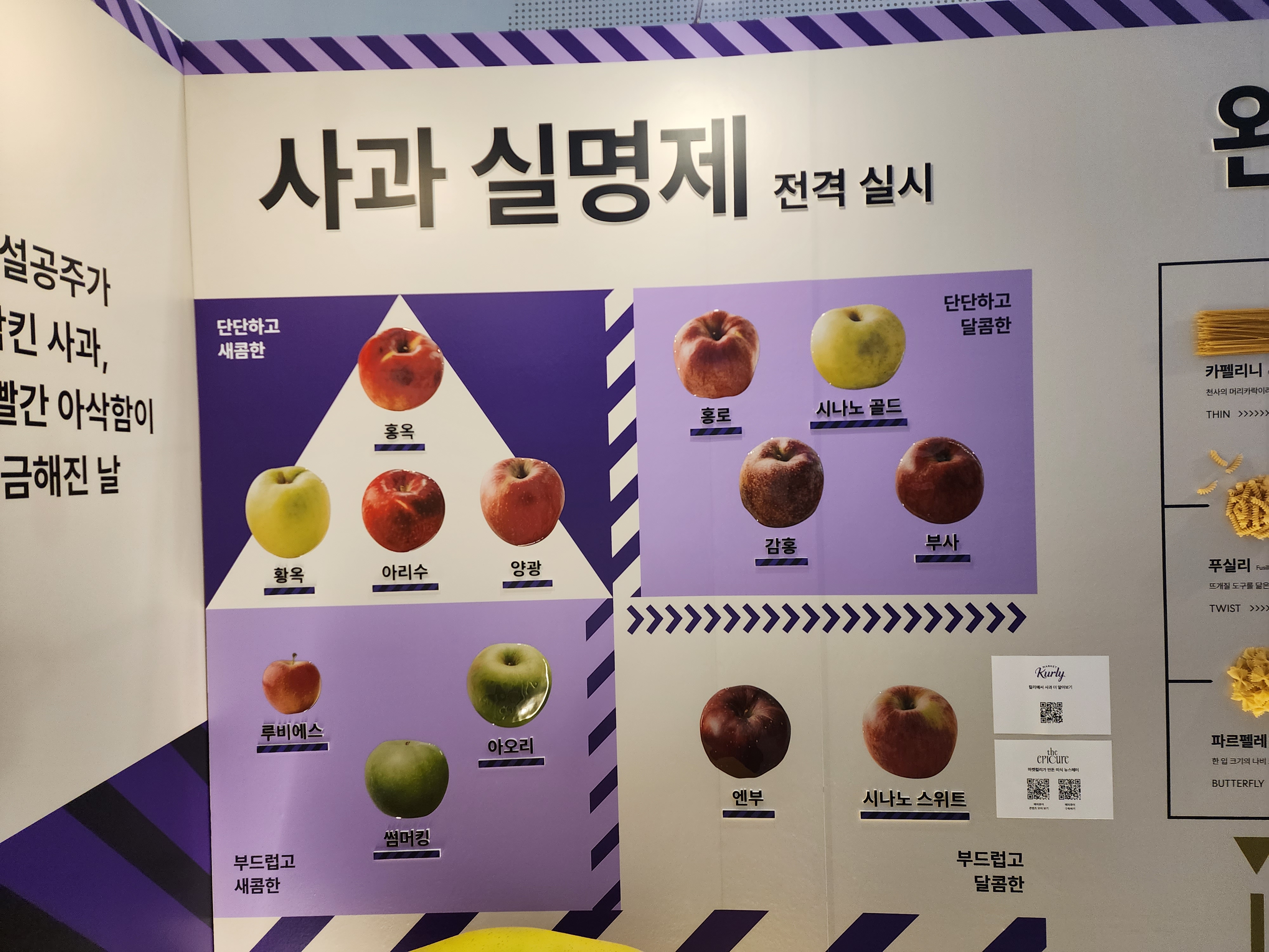 1관 브랜드 존에서는 커피, 사과, 파스타, 치즈에 대한 연대기와 종류 유형별 설명을 볼 수 있었어요. 전 사과를 좋아하는데 사과가 이렇게 종류도 많고 맛도 다른지 처음 알았습니다. 사과라 하면 그냥 달달하며 신선한 게 최고라고 생각했었거든요. 음식 맛에 대해 잘 안다고 생각했지만, 원재료조차도 구분 못하고 있었다는 게 굉장히 새로웠어요.