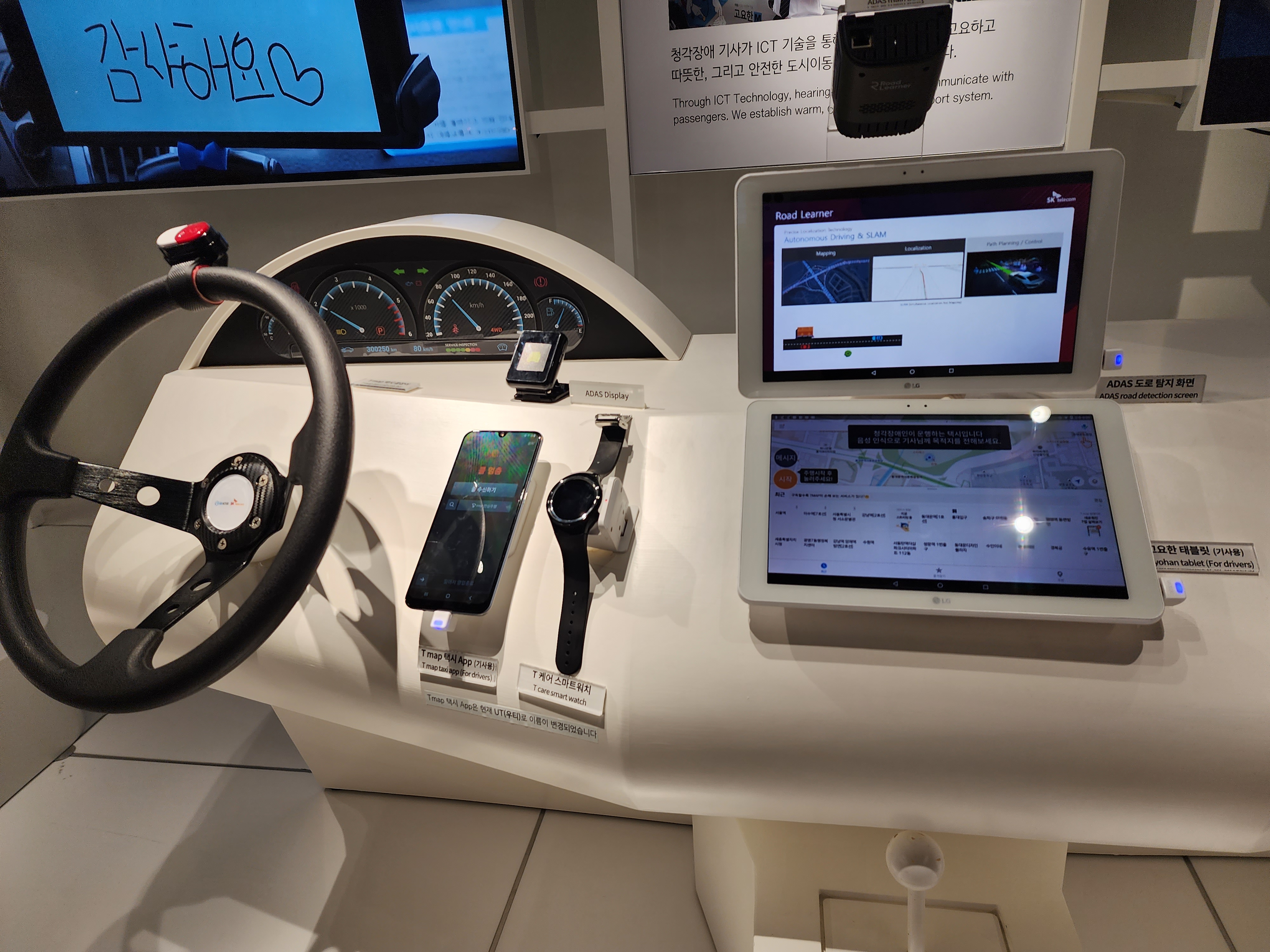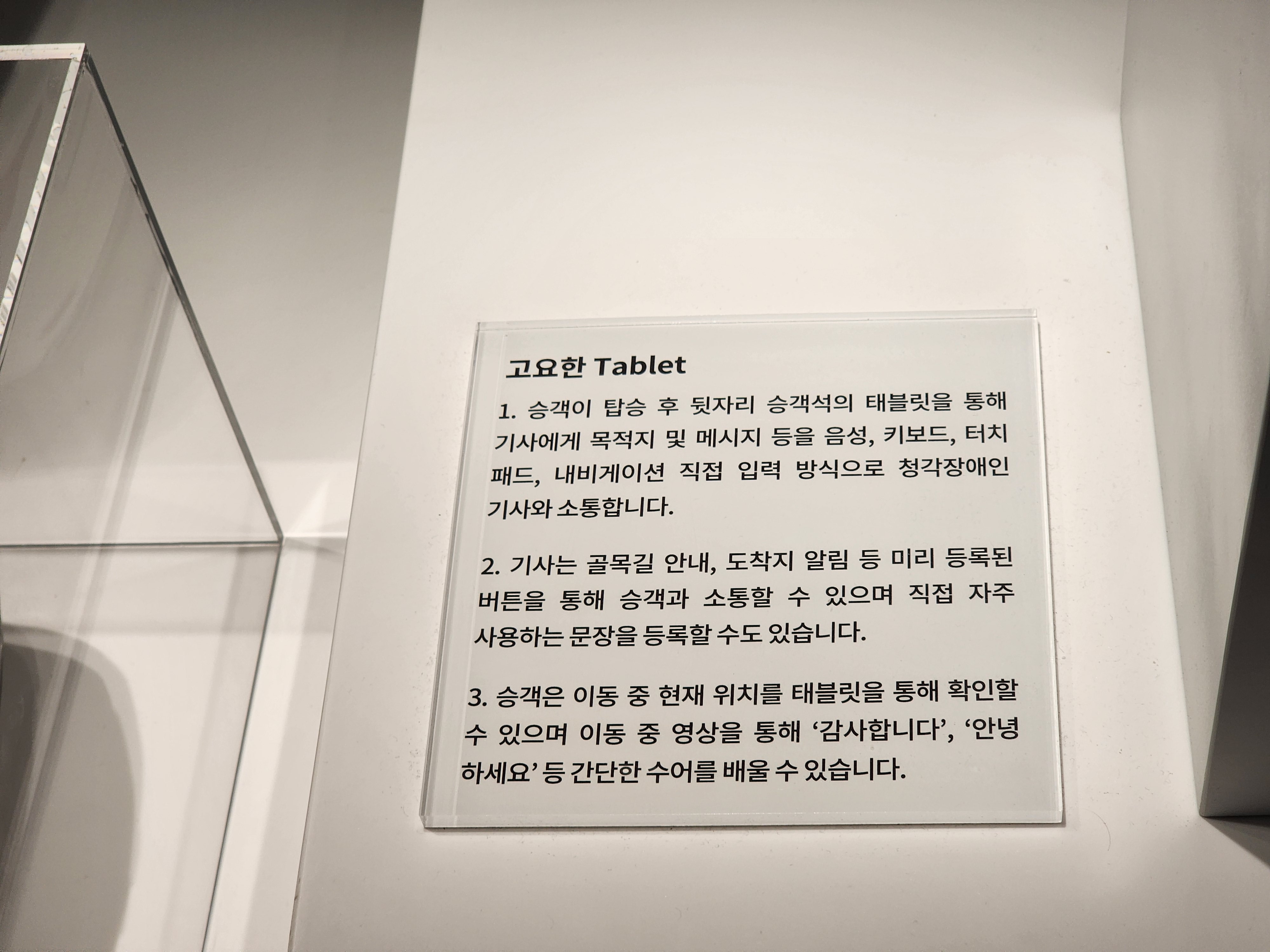 청각장애 기사분과 태블릿으로 소통할 수 있다는 것도 참 좋았습니다. 다만, 제가 저 태블릿을 만졌을 땐 반응하지 않아 좀 아쉬웠어요....ㅠㅠ 저도 체험해보고 싶었거든요. 어떻게 보면 의사소통이 어려운거지 택시로 운전하시는데에는 큰 문제가 없다고 생각하거든요.