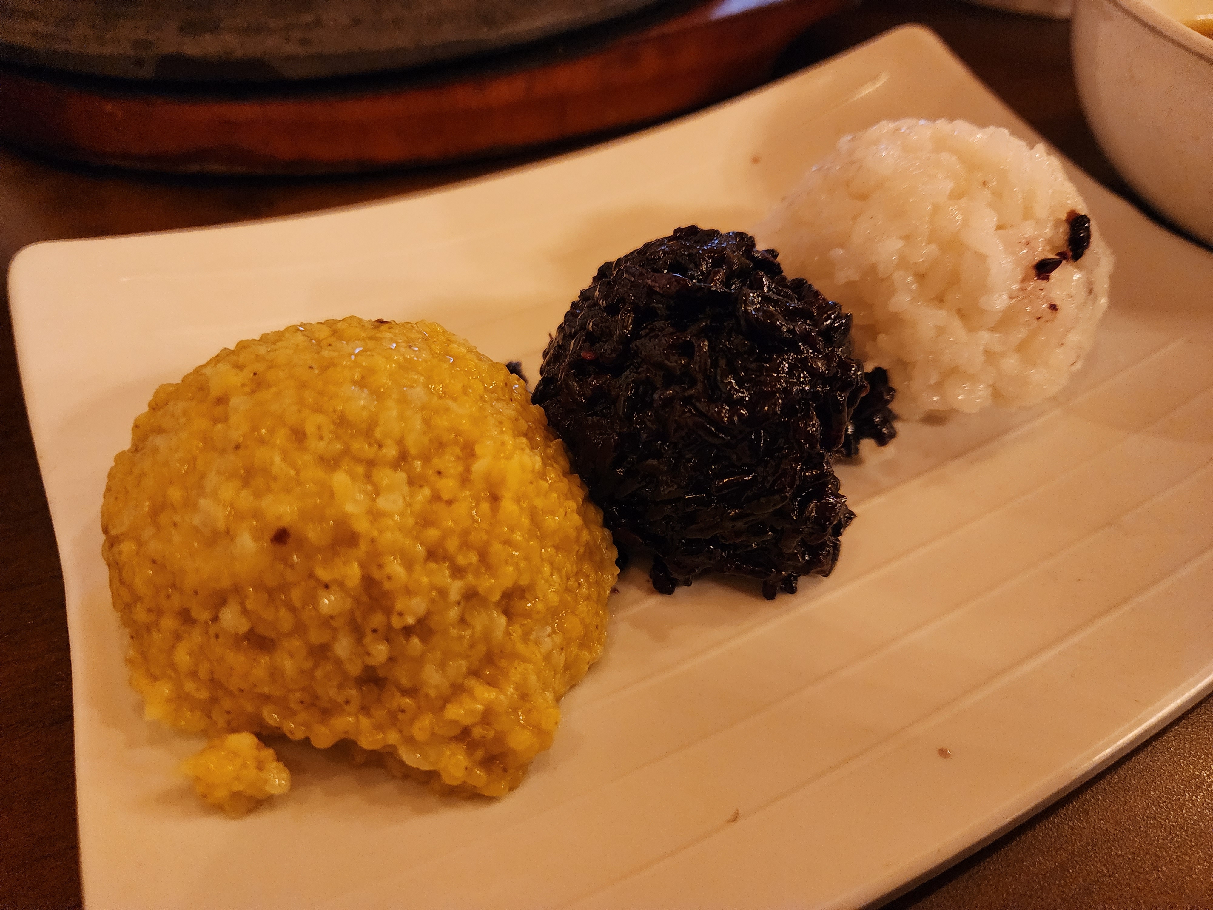 크.... 정말 예쁘지 않나요? 노오란 조밥은 살짝 질고 흑미밥은 쫀쫀하며 살짝 단맛이 납니다. 흰 쌀밥은 다들 아시는 맛입니다. 그래도 쌀을 좋은 걸 썼다는게 느껴졌어요.