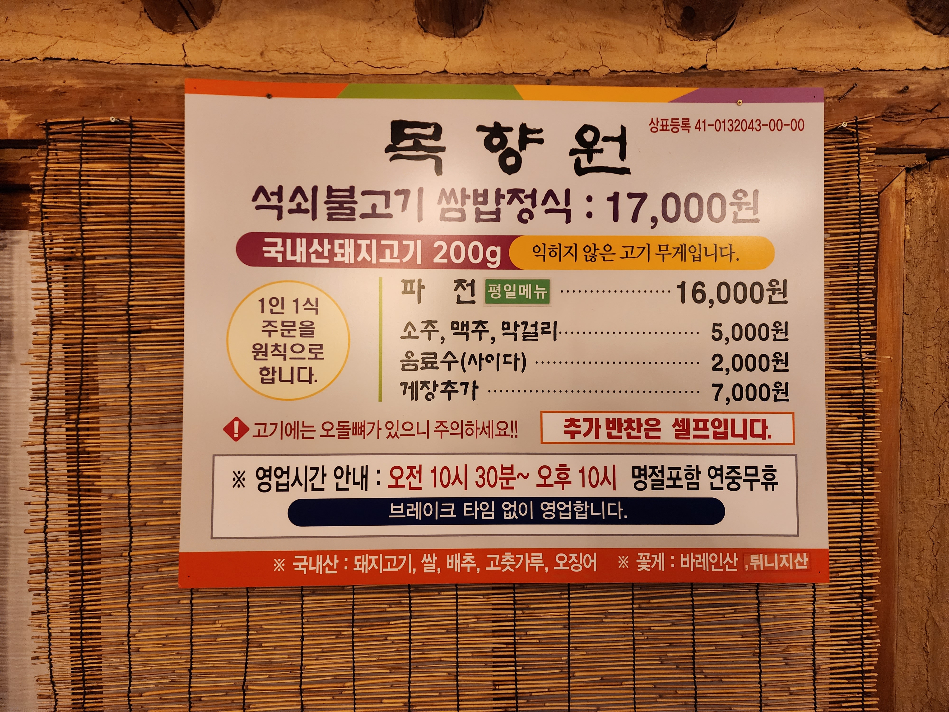 메뉴판은 굉장히 SIMPLE 합니다. 석쇠불고기 쌈밥정식 : 17,000원이 메인이에요. 생각보다 비싼 것 같지만 쌈채소와 고기 그리고 밥들이 나오는 걸 보시면 오... 괜찮은데? 싶으실꺼에요.